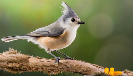 Tufted Titmouse (baeolophus bicolor) on a stick with a green background