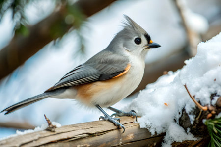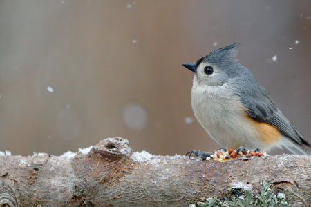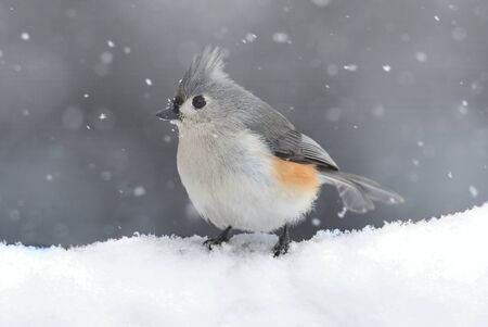 Tufted Titmouse (baeolophus bicolor) on a tree in a snow storm