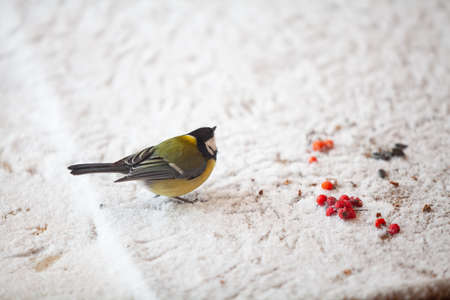 Tit closeup. Bird standing on the snow and eating corn seeds upper view