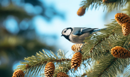 Blue tit tit on a fir branch with cones in the autumn forest.
