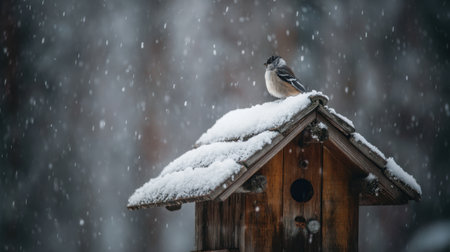 A beautiful winter scene featuring a small bird on a snow-covered birdhouse with gentle snowfall in a calm forest setting.