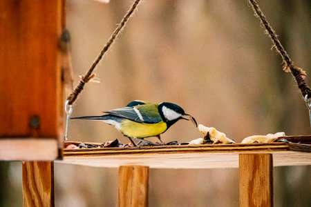 Hungry titmouse bird (latin name Parus major) is eating the sunflower seed in the wooden bird feeder. Birdfeeder in shape of house for small birds is placed on handrail. Closeup shot of wildlife.