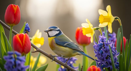Eurasian blue tit bird among spring flowers and sunlight