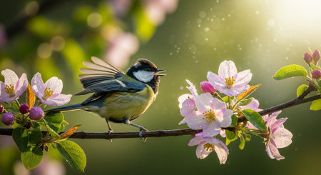 Great tit bird singing on blossoming branch in spring