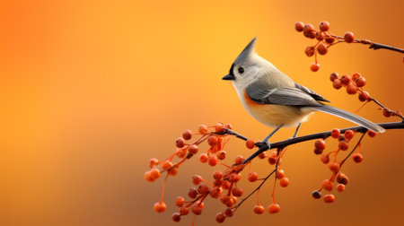 a bird perches on branches adorned with orange berries, capturing the radiant sun. the minimalist background enhances the silver and red tones, creating a soft-focus effect. this poetcore-inspired photograph showcases a richly colored and realistic animal portrait, with a striking use of vibrant hues. ai generated