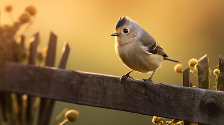 An adorable Tufted Titmouse (Baeolophus bicolor) perching on the wooden fence enjoy watching and resting on the blurry garden background, Autumn in GA USA.