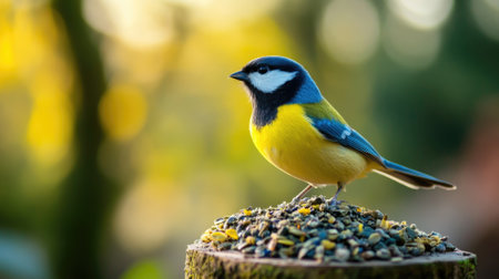 European tit bird sitting on fat. Bird feeding in winter. Beautiful wild bird.
