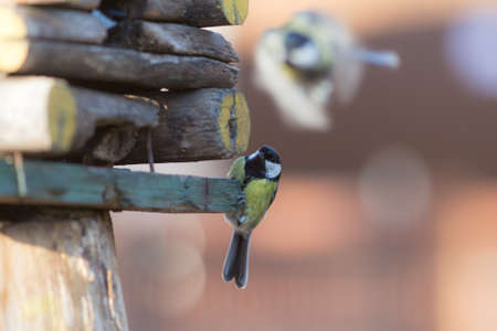 titmouse sitting on a wooden trough for birds