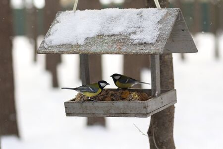 great tit and sparrow and sunflower seeds on the snow in winter. Feed the birds in winter.