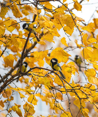Group of little songbirds perching on branch of tree on yellow autumn background. Great tit (Parus major)