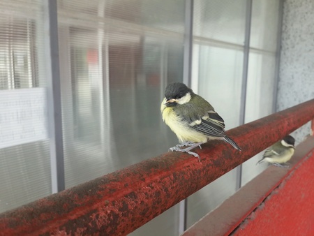 A large tit on the window in the house. Eats food in winter. Front view. Nature of Russia. Parus major.