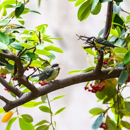 Great tit, baby titmouse who is fed by her mother