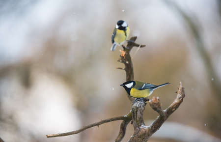 two beautiful bright birds tit and lapis lazuli are sitting on a branch in the winter garden