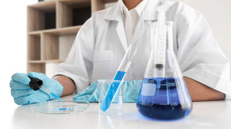 blue liquids in transparent flasks in the laboratory. test or research in lab. Technician testing chemistry lab experiment