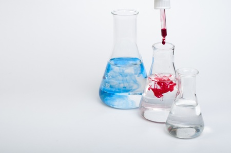 Laboratory chemical liquid elements and research diagnoses, instruments and objects in the sterile table, glassware and pipette. Studio shoot.