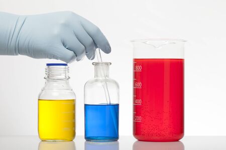 A hand in laboratory gloves mixes chemistry. Liquid in laboratory bottles. Scientific biochemical laboratory. Colorful liquid. Isolated on white background, a group test tubes.