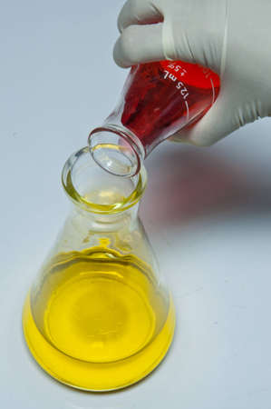 Hands of a laboratory technician wearing blue gloves pouring red liquid from a test tube into an Erlenmeyer flask. Medical and scientific concept.