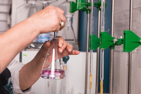 Scientist in a laboratory holding a volumetric flask containing a purple chemical. Titration analysis