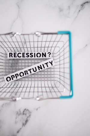 recession or opportunity texts inside of shopping basket, concept of post pandemic economy worldwide