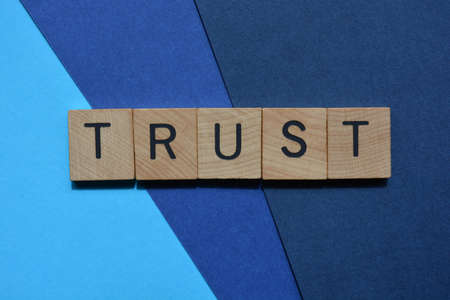 Trust, word in wooden alphabet letters on blue background
