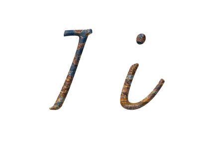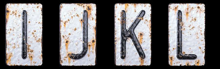 3D render set of capital letters I, J, K, L made of forged metal on the background fragment of a metal surface with cracked rust.