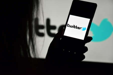 Kharkiv, Ukraine - December 20, 2021: A phone with a Twitter screen in the hands of a young girl against the background of a monitor. selective focus.