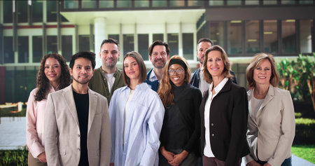 Portrait of a group of co-workers outdoors a corporate office area.