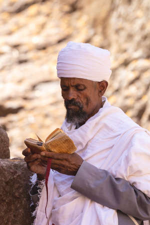 LALIBELA, ETHIOPIA, MAY 1st. 2019, Orthodox Christian Ethiopian man reading bible in front of famous rock-hewn St. George's Church after Mass on May 1st. 2019 in Lalibela, Ethiopia