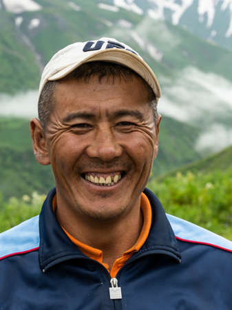 Kaldamo Pass, Kyrgyzstan - July 3, 2019: Portrait of a man at the Kaldamo pass with green mountains with snow and foggy clouds in the valley.