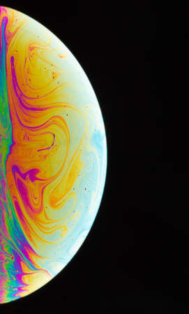 Soap Bubble Ball on black background. Abstract semicircle colorful background. Model of Space or planets universe cosmic. Real macro photo.