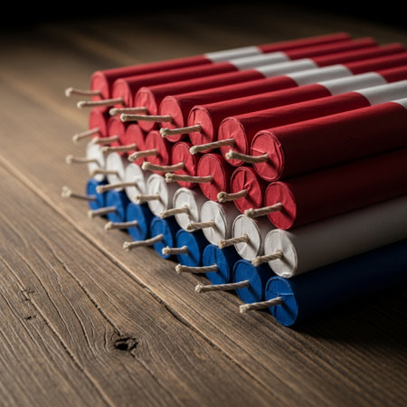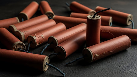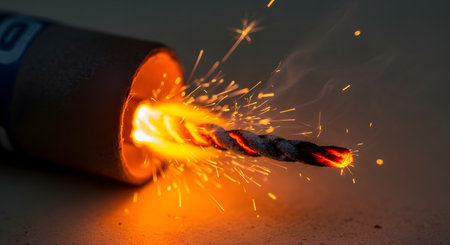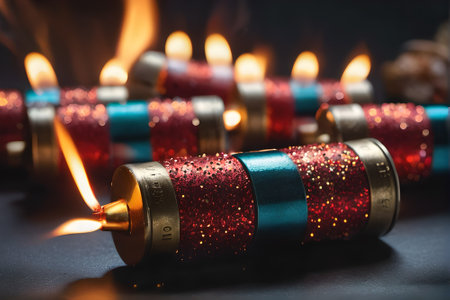 The image features a close-up shot of a lit firecracker and several small objects lying on a textured surface. The scene is illuminated by natural light, enhancing the colors and textures. The composition includes details of the surrounding environment, creating potential use for illustrative or thematic purposes.