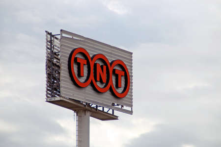 Alcobendas, Spain. 10 27 2018. Poster for TNT Express, courier service, on a cloudy day. Logo at the Alcobendas headquarters.