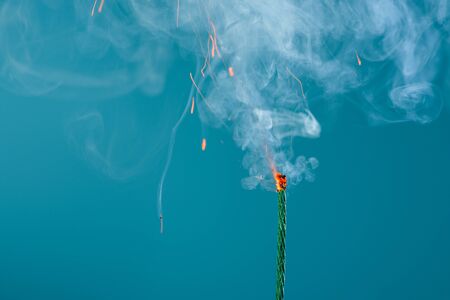 A macro shot of a lit fuse on a dynamite stick or large firecracker, glowing brightly with orange flames and yellow sparks. The image captures the sense of urgency, danger, and an impending explosion against a dark, moody background.