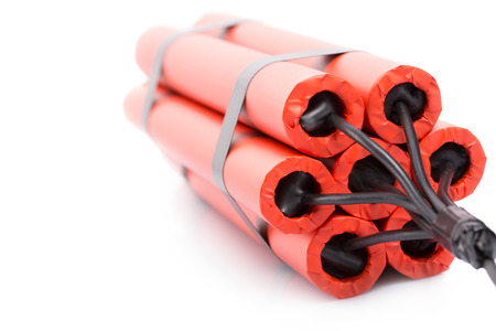 Dynamite with a remote fuse hung on a white wall. An explosive charge in an apartment building. Light background.