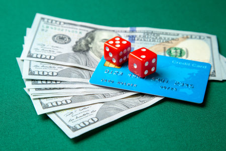 Gambling in casino. Money cash dollars and credit brief with dice for games on the green table.