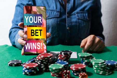 inscription your bet wins on a smartphone on the poker table. Bets, sports betting, bookmaker. Mixed media.