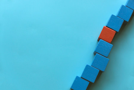 Red wooden cube among others. different, leadership, teamwork concept. Banner with copy space.