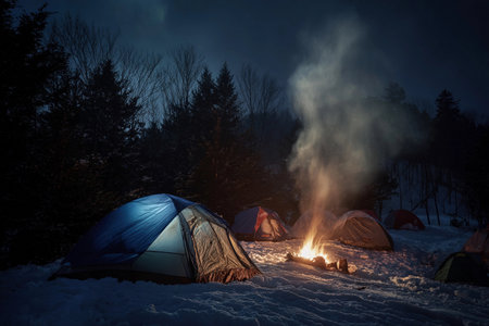 Campers gather around a fire as smoke rises into the night air near their tents in the snow.