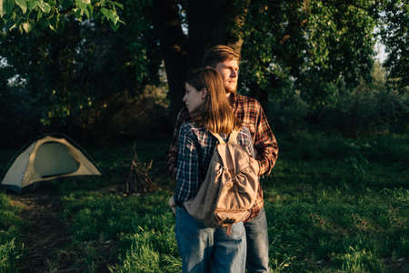 A loving couple of travelers in a sunny forest stand near the tent hugging each other. Man and woman on vacation. Caucasian spouses traveling. vacation concept.