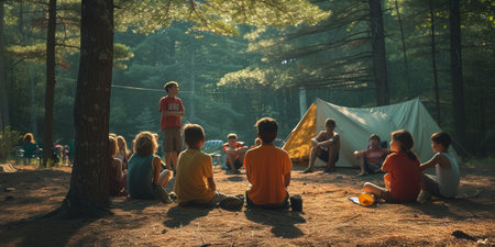 Wilderness retreat: camping, hustle of daily life to find solace in the natural world, setting up tents, cooking over open flames, and creating memories surrounded by beauty and peace of nature.