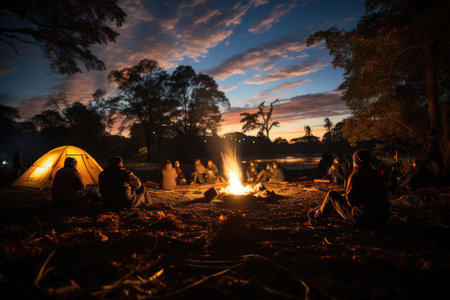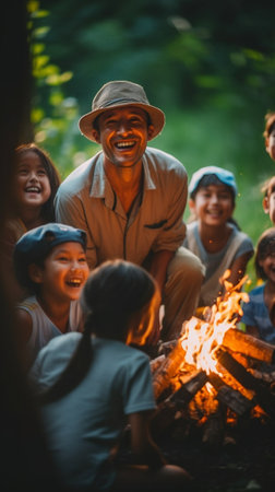 Friends huddling around glowing campfire in lush forest, sharing laughter during summer wilderness adventure