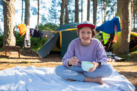 An 11 year old boy or teenager has breakfast with cereal and milk, sitting on a blanket in front of a tent in the forest, spending summer holidays in a tent camp.
