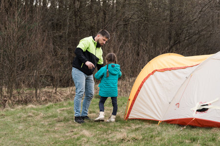 A happy father and daughter are setting up a camping tent. Family time, family rest, care