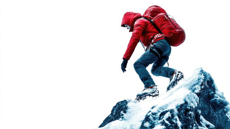 A solo climber ascends a snowy mountain peak, clad in a bright red jacket and carrying a backpack. The image captures the essence of adventure and determination in a stunning winter landscape.