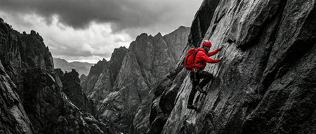 Male rock climber in red jacket scaling a rock face in a dramatic mountain landscape. Concept of extreme darecation adventure tourism.