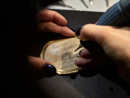 CAM device milling detailed brooch patterns from resin block in jewelry workshop