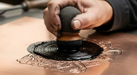 A close-up of an artist's ink-stained hand using a dauber to apply black ink to an intricately etched copper plate. The ink is spread in a circular motion over the detailed design. This image captures the traditional process of intaglio printmaking, craftsmanship, and art creation.