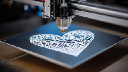 A laser tool precisely engraves detailed patterns onto a surface, illuminating the workspace in a striking red hue, showingcasing craftsmanship in action.