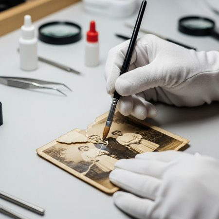 Belarus, Soligorsk, July 1, 2019: mastery of restoring old vintage damaged photos of close-up specialist working place with a pair of tweezers with a magnifying glass and gloves
