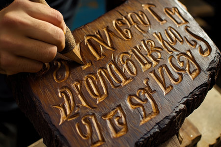 Skilled artisan carefully carves elegant symbols into a wooden surface using specialized tools for intricate designs.